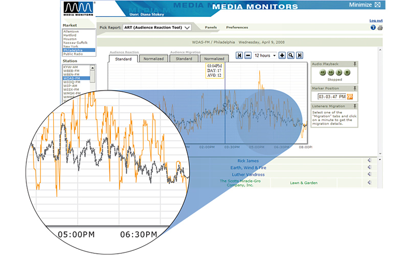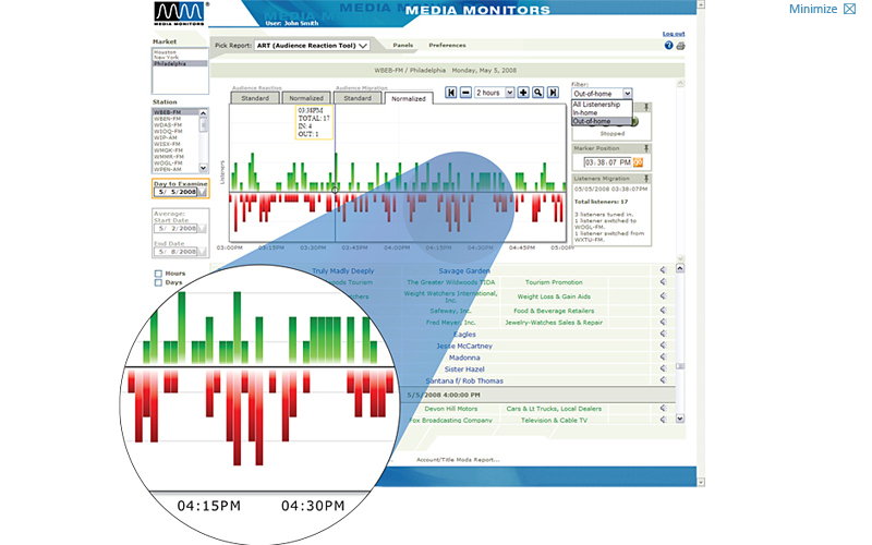 From the Media Monitors web site, you can retrieve what was played on the air shown in our traditional log format. You can play back the audio of what was broadcast. See a graph of the behavior of the listeners in the PPM panel who were tuned into your station. This helps you instantly spot peaks and dips in ratings. In addition, you can filter the PPM data to see in-home and out-of-home listening levels.