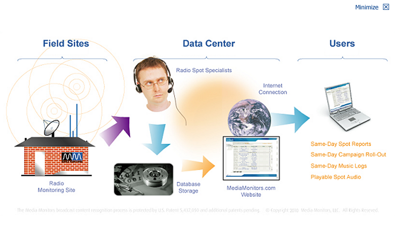 Media Monitors’ patented radio monitoring technology listens to top-rated radio stations in major markets across the country. Our computers automatically track millions of recurring commercials 24/7, 365 days a year. Our team of spot data specialists research and identify hundreds of new advertisers and commercials every day. Media Monitors Radio service provides occurrence and expenditure information with Audience Reaction® and AdRev™.