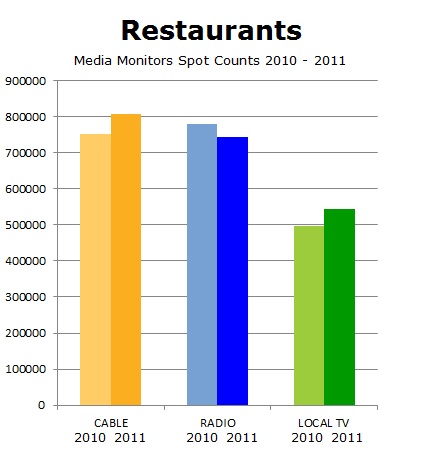The wide-ranging local data from Media Monitors across as many as 50-85 markets across the different local media also shows that Restaurants ads devoured the most inventory in Cable TV and in Radio in the Top 12 markets so far in 2011.