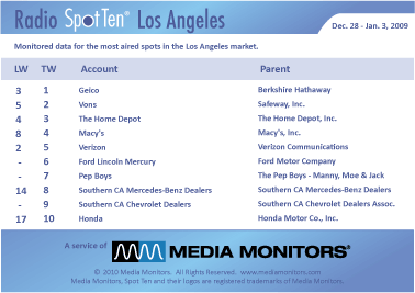 The #1 spot in LA radio last week was GEICO with 1,262 spots. VONS came in #2 with 1,214, while THE HOME DEPOT landed in #3 with 1,209 ads. MACY'S was #4 running 941 spots and VERIZON was #5 airing 685 announcements. FORD LINCOLN MERCURY was back on the air at #6 with 599, while PEP BOYS popped into #7 with 590 ads. SOUTHERN CALIFORNIA MERCEDES-BENZ DEALERS jumped #14 to #8 with 544 spots and SOUTHERN CALIFORNIA CHEVROLET DEALERS landed in #9 with 540 commercials. HONDA was #10 running 512 spots.
