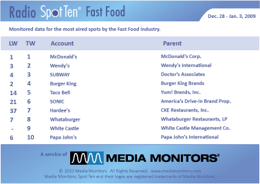 On the national Fast Food scene the #1 radio advertiser was MCDONALD'S with 18,429 spots. Coming in #2 was WENDY'S with 7,469, while SUBWAY was #3 airing 6,909 ads. BURGER KING was #4 with 3,210 spots and TACO BELL was #5 with 3,191 commercials. SONIC soared from #21 to #6 with 1,560 ads, while HARDEE'S hit #7 running 1,178 spots. WHATABURGER was #8 with 987 spots and WHITE CASTLE was #9 with 978 spots. PAPA JOHN'S came in #10 with 736 spots nat