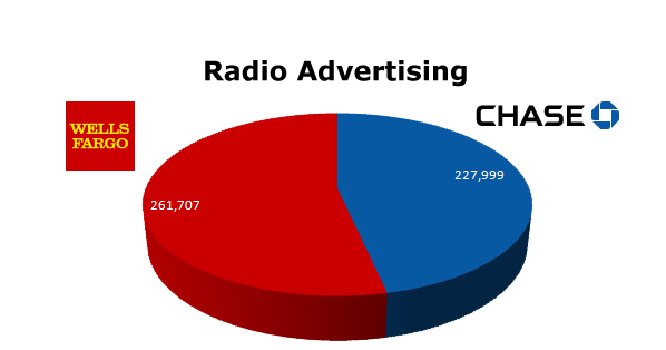 On the radio, Wells Fargo tops Chase with their 261,707 spots against 227,999 for Chase.