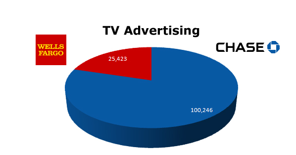 On TV, Chase owns the game with 100,246 ads in the last 12 months compared to Wells Fargo's 25,423.