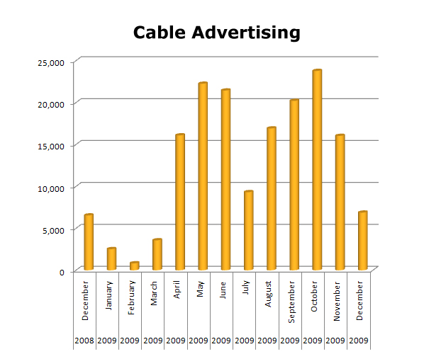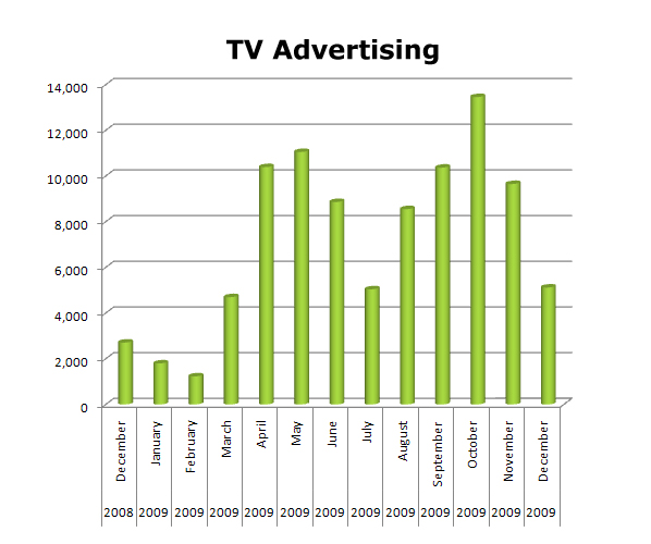 On Cable TV in the last year, THE HOME DEPOT started out rather slowly, adjusting to the bad economy and global financial worries. But as the year progressed, they step up the marketing effort. With strong months in April, May and June (summer outdoors) and then coming back in the fall with its strongest month in October of 2009, THE HOME DEPOT rebounded nicely in 2009. In the last 13 months they ran 166,478 spots on Cable TV.
