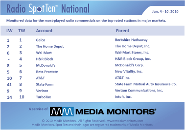 In Radio, GEICO shows a pattern of heavy time buys in January with that month last year hitting 255,697 spots in that month. In the first two weeks of 2010, we see GEICO at #1 and this week, ran more than 60,000 radio spots for the week nationwide.