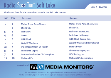 In the city by the big salt lake, the #1 advertiser was MOTOR TREND AUTO SHOWS with 793 spots. Coming in #2 was the SHANE COMPANY with 681 ads, while WAL-MART was #3 with 535 commercials. GEICO was #4 running 464 spots and H&R BLOCK jumps into #5 with 435 spots. WEIGHT WATCHERS expands into #5 with 432 ads, while UTAH DEPARTMENT OF HEALTH jumps from #46 to #7 with 392 spots. THE HOME DEPOT nails down #8 with 391 spots and INTERNATIONAL SERIES OF CHAMPIONS (ISOC Racing) was #9 airing 381 announcements. MCDONALD'S slid into #10 with 365 spots.