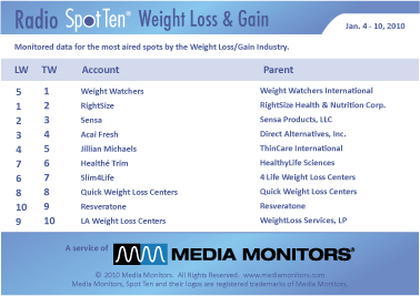 Everyone makes resolutions for a new year, and many are losing weight and eating right. Here are the performers: #1 WEIGHT WATCHERS with 9,850 spots nationally. Next, #2, was RIGHTSIZE with 7,724, while SENSA was in at #3 with 5,907 spots. At #4 we see ACAI FRESH with 4,096 spots and JILIAN MICHAELS (ThinCare) was a size 5 with 1,083 spots. HEALHTE TRIM was#6 airing 779 ads, while SLIM4LIFE was #7 running 672 spots. QUICK WEIGHT LOSS CENTERS was #8 with 636 spots and RESVERATONE was #9 with 621 ads. LA WEIGHT LOSS CENTERS was #10 running 581 spots.