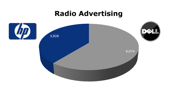 Radio is not part of the computer manufacturers' plan. HP only ran 3,926 spots in the last year and Dell ran only 6,074 spots, and most of those Dell spots were run December 2008, with very few in 2009.