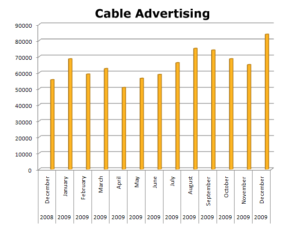 In Cable TV, GEICO is very consistent. They ran hot in December 2009, with 83,829 spots that month. With some of the figures in for 2010 already, look for GEICO to make major contributions in all media.