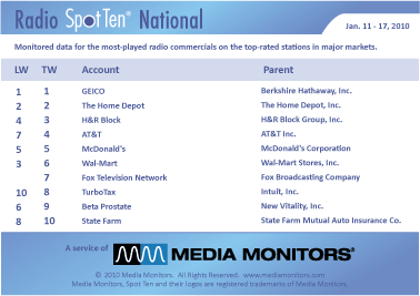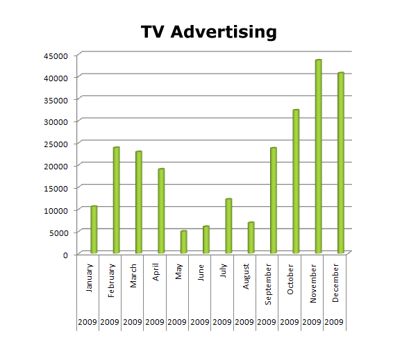 In Radio, 2009 was not such a great year for them in radio. They only ran 403,588 spots in 2009 (compared to the #1 radio advertiser, GEICO running 1,935,333 spots).