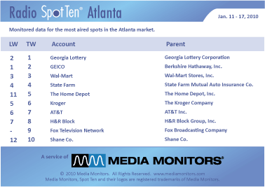 The number one advertiser on the radio in Atlanta last week was the GEORIGA LOTTERY running 1,002 spots. GEICO was #2 with 807 ads, while WAL-MART stayed at #3 with 762 spots. STATE FARM was #4 airing 690 advertisements and THE HOME DEPOT jump #11 to #5 with 689 spots. KROGER was #6 running 607 commercials, while AT&T came in #7 with 578 spots. H&R BLOCK was #8 with 577 ads and FOX TELEVISION NETWORK was #9 (pushing their 24 debut) with 526 spots. #10 was the SHANE COMPANY with 412 spots.