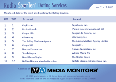 On the national level in the category, DATING SERVICES, the king and queen of the hill is CUPID.COM running 3,708 spots. IT'S JUST LUNCH has a table for #2 with 581 ads, while COUGAR LIFE purred into #3 with 402 spots. eHARYMONY was #4 with 101 ads and THE ASHLEY MADISON AGENCY was #5 with 93 ads. COUGAR911 was #6 running 45 spots, while NUEVOS ENCUENTROS came in #7 airing 35 spots. TEXTDATING.CA was #8 with 30 spots and BLUE RIBBON SINGLES was #9 with 24 spots. BUFFALO NIAGARA INTRODUCTIONS came in #10 with 24 spots, as well.