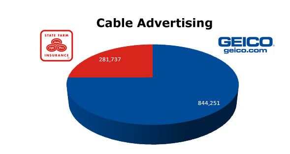 GEICO is a major advertiser in the United States. On Cable last year, they ran 844,251 spots against State Farm's 281,737 ads.