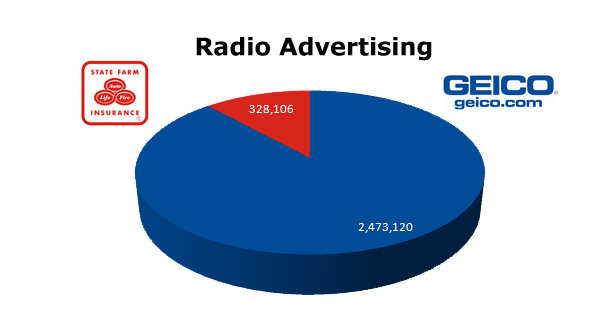 GEICO is the big boss in radio with 2,473,120 spots against State Farm's 328,106.