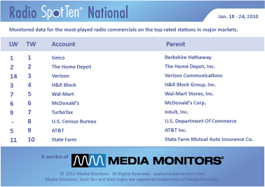 GEICO stays on top with 53,540 spots. THE HOME DEPOT hammered out 33,079 spots to take #2, while VERIZON jumped from #14 to #3 with 31,742 ads. H&R BLOCK dropped from #3 to #4 with 26,609 spots and WAL-MART stepped up from #7 to #5 with 24,294 spots.