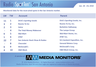 In San Antonio, Texas last week, the #1 radio advertiser was DICK'S SPORTING GOODS with 412 spots. ROOMS TO GO was #2 with 395 ads, while GEICO was #3 with 390 spots. THE TOTAL MONEY MAKEOVER was #4 running 383 spots and WAL-MART was #5 with 370 spots. AT&T came in #6 with 338 spots, while SAN ANTONIO STOCK SHOW & RODEO was #7, up from #22, with 335 commercials. CHEVROLET was #8 airing 331 announcements and MCDONALD'S was #9 with 314 spots. Coming in #10, H&R BLOCK dropped from #4 to #10 with 303 spots.