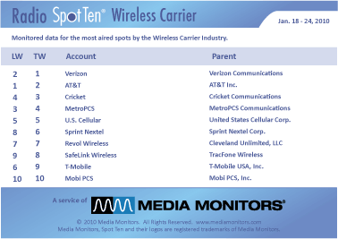 There is no doubt the influence cell phones have had on the economy and culture. And these multi-billion dollar companies certain do use radio. VERIZON was #1 with 31,742 spots. AT&T was #2 with 16,275 ads, while CRICKET was #3 running 6,696 spots. METROPCS was #4 airing 5,794 ads and U.S. CELLULAR was #5 with 2,811 commercials. SPRINT NEXTEL was #6 with 909 spots, while REVOL WIRELESS was #7 airing 757 spots. SAFELINK WIRELESS was #8 running 533 ads and T-Mobile was #9 with 289 spots. Coming in #10 was MOBI PCS with 227 spots.