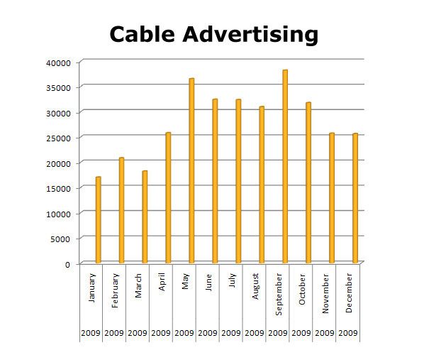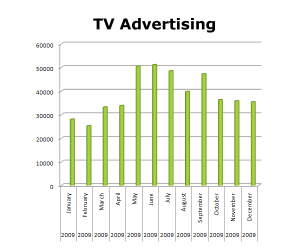 On Cable TV in the last year, THE HOME DEPOT started out rather slowly, adjusting to the bad economy and global financial worries. But as the year progressed, they step up the marketing effort. With strong months in April, May and June (summer outdoors) and then coming back in the fall with its strongest month in October of 2009, THE HOME DEPOT rebounded nicely in 2009. In the last 13 months they ran 166,478 spots on Cable TV.