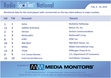 The top dog was actually a Gecko with GEICO at #1 again with 34,287 spots. SAFELITE AUTOGLASS jumps from #11 to #2 with 28,824 ads, while VERIZON was #3 with 27,566 commercials. MCDONALD'S was #4 airing 24,195 spots and AT&T came in #5 with 19,823 spots. OF NOTE: FORD LINCOLN MERCURY was #10, up from #15 with 16,919 spots, NISSAN was #22 with 10,496 spots and TOYOTA was #38 with 6,922 recall-related announcements.