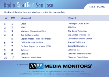 The #1 advertiser on the radio last week in San Jose was CHASE with 355 spots. AT&T was #2 running 232 commercials, while MATTRESS DISCOUNTERS WEST was #2 with 206 ads. BEN BRIDGE JEWELER came in #4 with 195 spots and CAPITOL MAZDA - OAK TREE MAZDA was #5 airing 169 announcements. CALIFORNIA STATE AUDITOR was #6 running 160 announcements, while ORCHARD SUPPLY HARDWARE was #7 with 160 ads as well. SAFEWAY hit #8 with 148 spots and VERIZON was #9 running 144 ads. CLOSEOUT CLUB ONLINE was #10 with 136 spots.