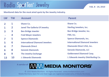 On the national level, SHANE COMPANY reigns supreme with 7,692 ads. JARED THE GALLERIA OF JEWELRY was #2 with 7,601 commercials, while BEN BRIDGE JEWELER was #3 with 2,765 spots. FRED MEYER JEWELERS was #4 airing 2,720 announcements and SPENCE DIAMONDS hit #5 with their 1,610 spots. INTERNATIONAL DIAMOND JEWELERS was #6 with 1,484 spot, while DIAMONDS DIRECT fell from #4 to #7 with 1,384 spots. GENESIS DIAMONDS was #8 with 972 spots and THE JEWELRY EXCHANGE was #9 with 891 ads. J. EDWARDS DIAMONDS was #10 last week with 794 spots.