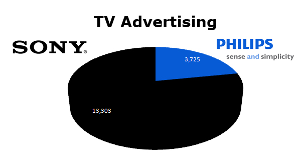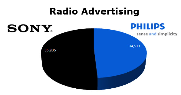 On the radio, this is about was a major advertiser would run in a month on AM and FM. Sony rolled 35,835 spots to Philips' 34,511.