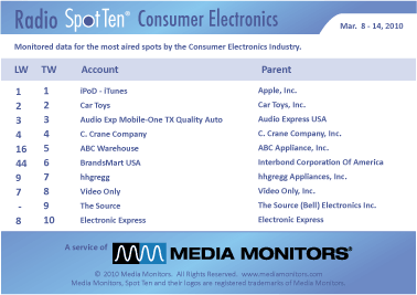 In this very lucrative category, the #1 spot IPOD-ITUNES with 2,800, while CAR TOYS was #2 with 2,533 spots. AUDIO EXP MOBILE-ONE TX QUALITY AUTO was #3 with 1,414 ads and C. CRANE COMPANY was #4 airing 863 spots. Jumping from #16 to #5 was ABC WAREHOUSE with 520 spots, while BRANDSMART USA was up from #44 to #6 with 413 ads. HHGREGG was #7 with 399 commercials and VIDEO ONLY was #8 showing 397 spots. THE SOURCE (Bell Electronics) was #9 with 352 spot and ELECTRONIC EXPRESS was #10 running 306 spots for the week.
