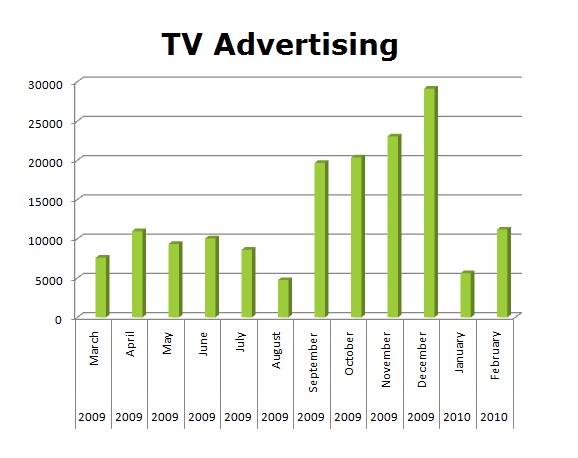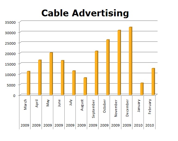 On Cable, Macy's has a little hill leading up to June weddings and another blitz for Christmas starting in September. They ran a total of 212,890 spots on Cable with December having the most in any month at 32,338 spots.