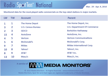 On the national front, this is the second week of THE HOME DEPOT topping the charts with 40,038 spots. Spring is here. #2 was the US CENSUS BUREAU running 39,717 announcements, while GEICO came in #3 with 32,517 spots. AUTOZONE was #4, up from #15 with 29,308 ads and VERIZON was #5 airing 23,797 spots.