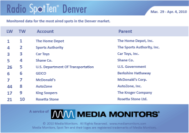 The #1 radio advertiser in Denver last week was THE HOME DEPOT with 792 spots. The SPORTS AUTHORITY was #2 with 746 ads, while CAR TOYS was #3 with 618 commercials. SHANE COMPANY (based in Denver) was #4 with 605 spots and the US DEPARTMENT OF TRANSPORATION was #5, up from #26 with 502 spots. GEICO was #6 running 476 ads, while MCDONALD'S was #7 with 462 ads. AUTOZONE came in #8, up from #44 with 452 spots and KING SOOPERS (Groceries) was #9 airing 435 announcements. ROSETTA STONE was #10 with 395 spots.