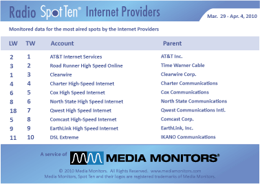 In the world of Internet services, the leader last week in America was AT&T with 1,507 ads. ROAD RUNNER HIGH SPEED ONLINE (Time Warner) was #2 running 926 spots, while CLEARWIRE was clearly #3 airing 333 announcements. CHARTER HIGH-SPEED INTERNET was #4 with 312 spots and COX HIGH SPEED INTERNET was #5 with 270 ads. NORTH STATE HIGH SPEED INTERNET was #6 with 219 commercials, while QWEST HIGH SPEED INTERNET was #7, up from #18 with 202 spots. COMCAST HIGH SPEED INTERNET was #8 with 157 ads and EARTHLINK HIGH SPEED INTERNET was #9 with 142 spots. Coming in #10 was DSL EXTREME with 89 spots nationwide. And if you didn't notice it, it seems that adding "High-speed Internet" to your name is an industry standard.
