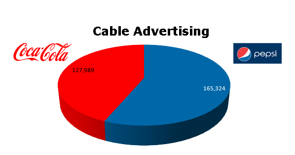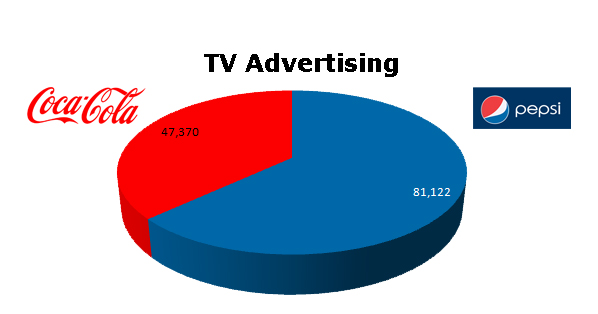 On TV, it appears that Pepsi almost doubles Coke. Pepsi ran 81,122 spots in the last 12 months to Coke's 47,370 spots.