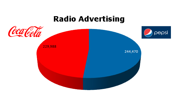 On the Radio, they two soft drink makers run neck and neck with Pepsi having a slight advantage with 244,470 spots to Coca-Cola's 229,988 ads.