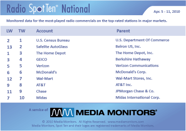 We have a new winner on the national advertiser front, and it is the US CENSUS BUREAU running 42,677 spots. SAFELITE AUTOGLASS was #2, up from #13, with 41,782 ads. THE HOME DEPOT falls from #1 to #3 with 33,053 spots. GEICO was #4 with 28,088 ads and VERIZON was #5 with 27,654 spots.