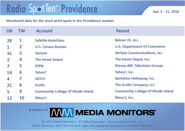 Last week in Providence the #1 radio advertiser was SAFELITE AUTOGLASS with 667 spots. The US CENSUS BUREAU was #2 with 415 ads, while VERIZON jumped from #31 to #3 with 400 commercials. THE HOME DEPOT was #4 with 307 spots and ESPN was #5 with 301 spots. YAHOO! Was #6 with 261 announcements, while GEICO was #7 with 257 spots. SCOTTS jumped from #21 to #8 with 256 ads, while COMMUNITY COLLEGE OF RHODE ISLAND was #9 with 252 spots. MACY'S was #10 with 216 spots.