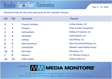PROACTIV SOLUTION was #1 with 6,915 spots in the Cosmetics & Skin Care category last week nationwide. CLINIQUE was #2 with 6,787 ads, while HYDROXATONE was #3 running 5,517 commercials. HYDROLYZE was #4 airing 4,740 announcements and CELTRIXA was #5 with 2,945 spots. BARE ESCENTUALS was #6 with 1,463 spots, while LASHATONE came in #7 with 802 ads. DERMAJUV came in #8 running 793 spots and PALMER'S was #9 with 710 spots. And coming in #10 was ESTEE LAUDER with 438 spots.