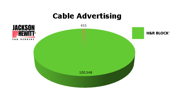 On Cable TV, Jackson Hewitt is almost a "no-show" with only 455 spots in the last 12 months to H&R Block's 100,548 spots. It is no surprise that the bulk of buying in this industry is from January to April (April 15 is Tax Day), even though offices are open year round. H&R Block ran 43,629 spots in January.
