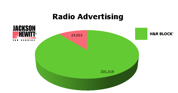 On Radio, Jackson Hewitt has a better showing with 24,053 spots, but once again, H&R Block ran ten times the number with 201,319 ads. Half of the Jackson Hewitt spots ran in January alone.
