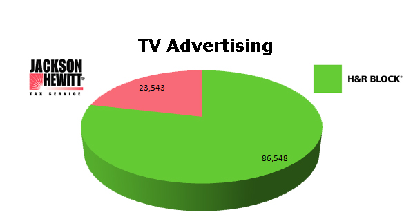 On TV, H&R Block ran 86,548 spots in the last 12 months against Jackson Hewitt's 23,543 ads. January had the most, with Jackson Hewitt hitting 16,482 spots against H&R Block's 36,822 January blitz.