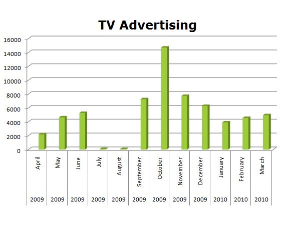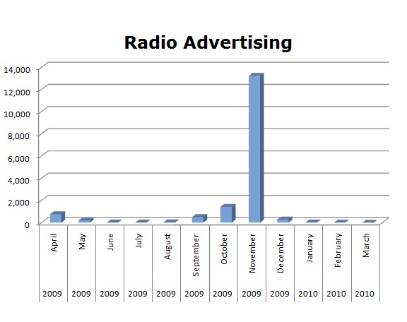 In Radio, 89% of their radio budget was placed in one month, November. That was 13,237 spots in that month, with a very small radio commitment of 16,444 spots in the last 12 months. I guess they like to show what they sell on TV.