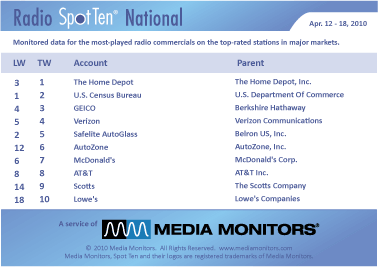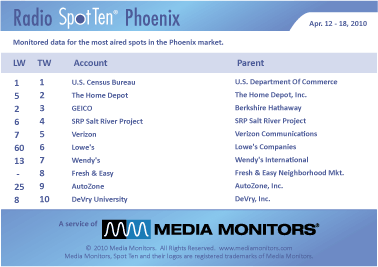 Last week in Phoenix the #1 advertiser was the US CENSUS BUREAU with 2,152 spots. Coming in #2 was THE HOME DEPOT with 986 ads, while GEICO was #3 with 792 spots. SRP SALT RIVER PROJECT was #4 airing 619 announcements and VERIZON was #5 with 594 spots. LOWE'S was #6, up from #66 and closing in on the Home Depot with 583 spots. WENDY'S was #7, up from #13 with 578 commercials, while FRESH & EASY (food market) was #8 running 504 spots. AUTOZONE was #9, up from #25 the previous week with 493 ads and in at #10 was DEVRY UNIVERSITY with 461 spots.