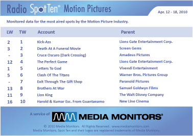 The number one movie in the USA on the radio last week was KICK-ASS running 2,998 spots. DEATH AT A FUNERAL MOVIE was #2 airing 2,394 commercials, while CRUCE OSCURO (DARK CROSSING) was #3 with 98 spots. THE PERFECT GAME came in #4 and only ran 40 spots and LETTERS TO GOD showed 24 spots. CLASH OF THE TITANS was #6 airing only 15 announcements, while EXIT THROUGH THE GIFT SHOW ran 14 spots. BROTHERS AT WAR had 4 spots nationally, with put them at #8 and LION KING was #9 with 3 spots. HAROLD & KUMAR ESCAPE FROM GUANTANAMO ran 2 spots to hold down #10 on the list.