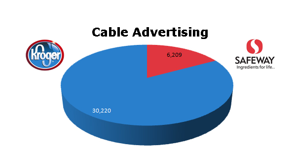 On Cable, Safeway ran 20% of the spots that Kroger ran. Kroger ran 30,220 in the last 12 months to Safeway's 6,209 ads.