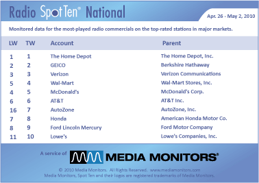 THE HOME DEPOT remains on top this week with 60,373 spots on the nation's radio stations. GEICO was #2 with 38,796, while VERIZON remained at #3 running 34,283 ads. WALMART moved to #4 airing 26,528 commercials, while MCDONALD'S moved to #5 with 25,001.
