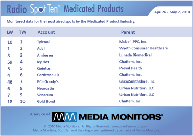 The leader on the radio in this category in the USA is, TYLENOL was #1 airing 10,066 spots. ADVIL was #2 with 5,115 ads, while AMBEREN was #3 with 3,209 ads. ICY HOT was solid at #4 with 1,024 announcements and QUIETUS was #5 running 970 ads. CORTIZONE-10 was #6 with 936 ads and BC-GOODY'S was #7 running 810 spots. NEUROSTIN was #8 with 755 spots, while VENACURA was #9 with 740 commercials. GOLD BOND came in #10 with 715 spots.