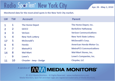 In New York City last week THE HOME DEPOT was the #1 advertiser on the radio with 1,589 spots. Coming in #2, GEICO ran 1,258, while VERIZON was #3 with 1,154 spots. NEW YORK LOTTERY came in at #4 with 765 ads and MCDONALD'S rolled into #5 with 605 commercials. HONDA remained at #6 with 591 spots, while METROPCS connected with #7 and ran 507 ads. WAL-MART jumped into place #8 with 482 spots and LOWE'S was a solid #9 with 479 spots. Coming in #10 was CHRYSLER - JEEP - DODGE with 443 spots.