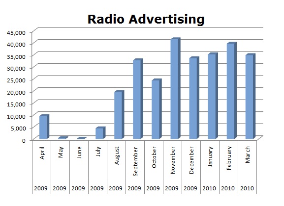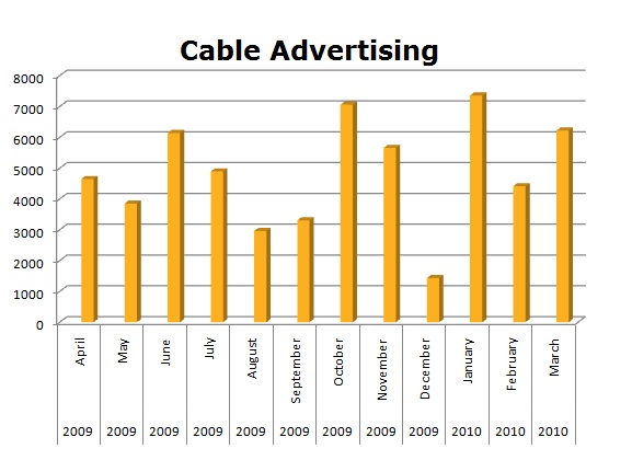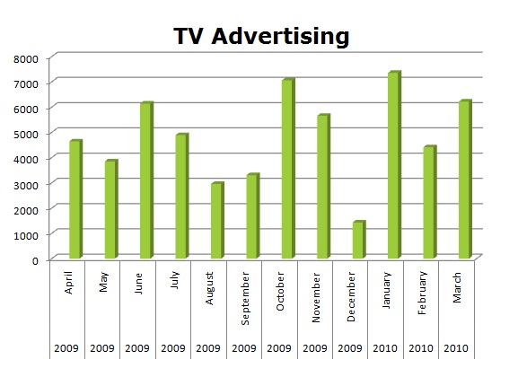 TV ads tend to merry-go-round with an up and down motion. Big months were June, October and January. The total number of TV ads for the last 12 months total 57,934.