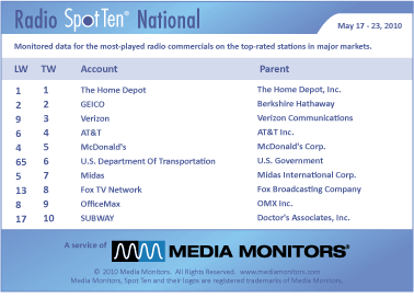 THE HOME DEPOT continues its run of consecutive #1 weeks with 50,038 spots aired nationally. GEICO was #2 with 38,741 commercials. VERIZON came in #3 with 28,028 spots, while AT&T was right behind them at #4 airing 24,803 spots. And coming in #5 last week, MCDONALD’S with 23,894 spots.