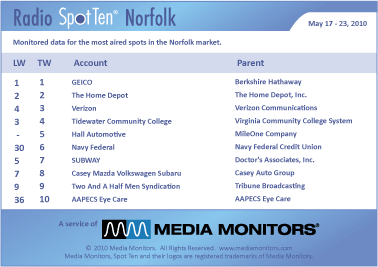 The #1 advertiser in Norfolk last week was GEICO running 908 spots. THE HOME DEPOT was #2 with 740 spots, while VERIZON was #3 airing 533 announcements. TIDEWATER COMMUNITY COLLEG was #4 with 512 spots and HALL AUTOMOTIVE came in #5 with 339 commercials. NAVY FEDERAL sailed from #30 up to #6 with 337 spots, while SUBWAY hit #7 with 331 spots. CASEY MAZDA VOLKSWAGEN SUBARU was #8 with 308 spots and TWO AND A HALF MEN SYNDICATION was #9 with 307 spots. And focusing on radio was AAPECS EYE CARE jumping from #36 to #10 with 298 spots.