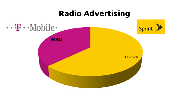 T-Mobile ran 66,652 spots on the radio in the last 12 months, while Sprint ran 112,374 ads. May was the biggest month for Sprint, while T-Mobile excelled in December.